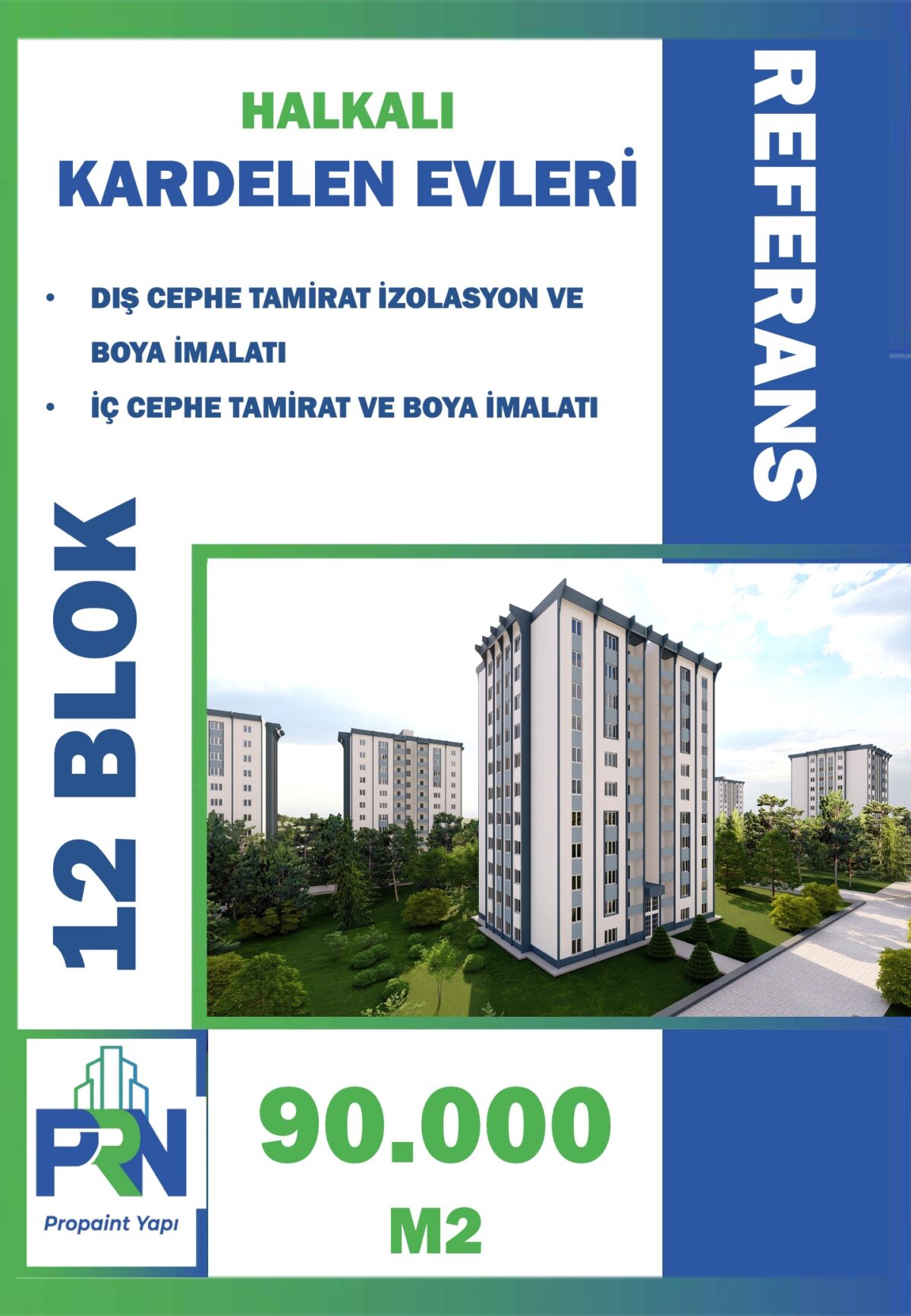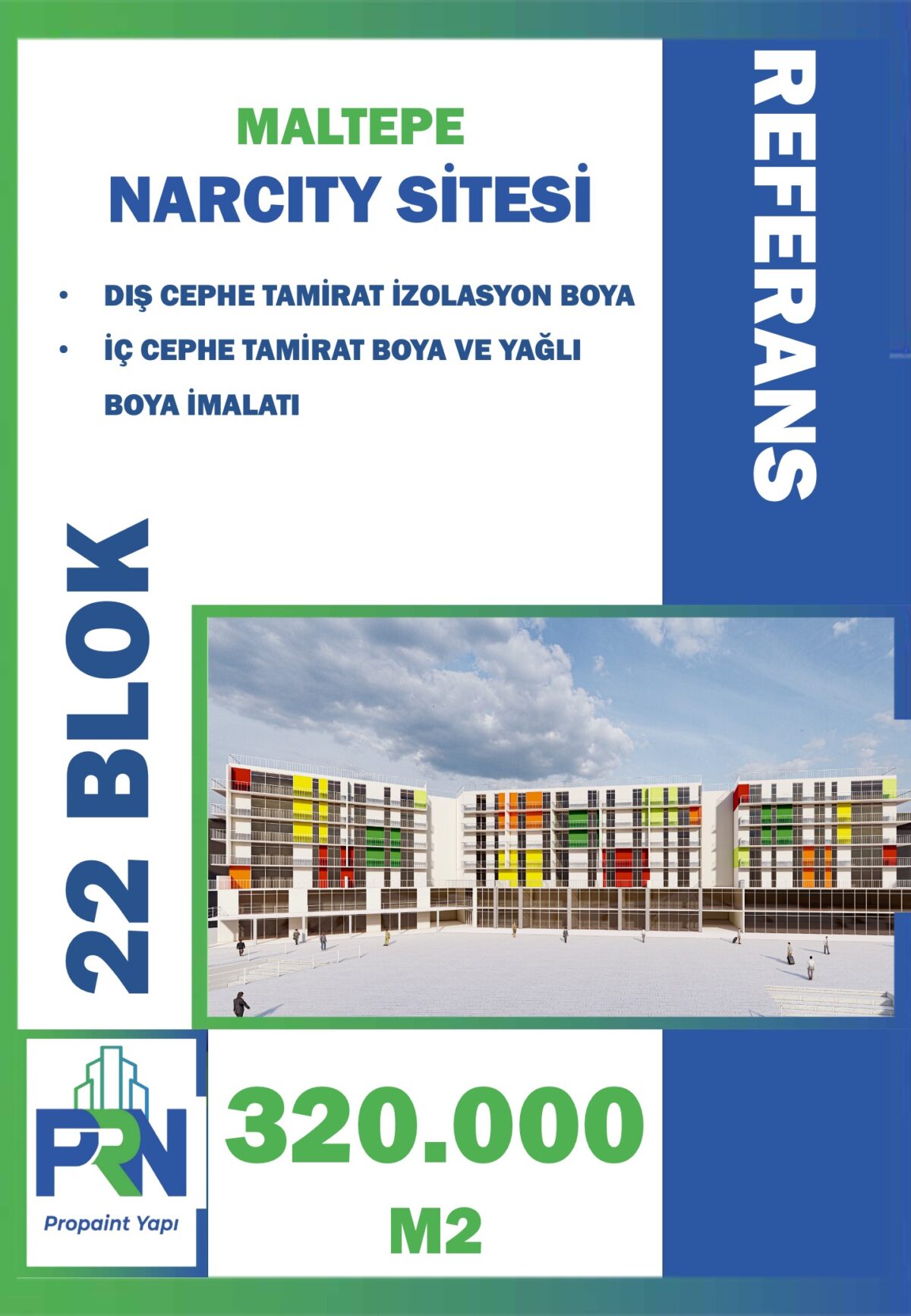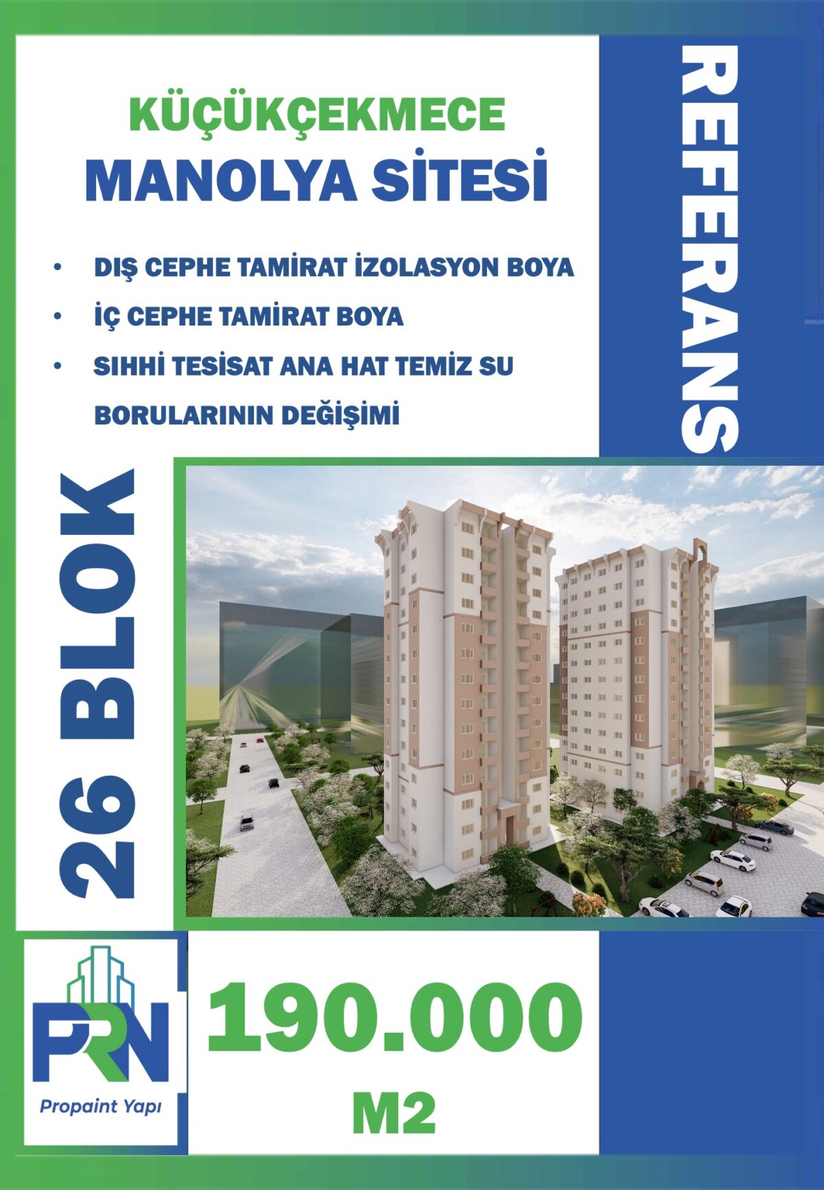 Proje: KÜÇÜKÇEKMECE AKASYA 1 SİTESİ Metraj: 75.000 M2 (14 BLOK) Tarih: 01.07.2021 Yapılan Çalışma: Dış ve iç cephe onarım izolasyon ve boya imalatı