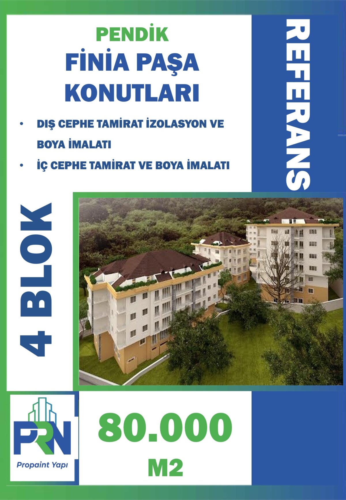 Proje: PENDİK FİNİA PAŞA PARK EVLERİ 4 BLOK Metraj: 70.000 M2 (4 BLOK) Tarih: 01.12.2011 Yapılan Çalışma: Dış – İç cephe Boya tamir ve fuga izolasyon işi