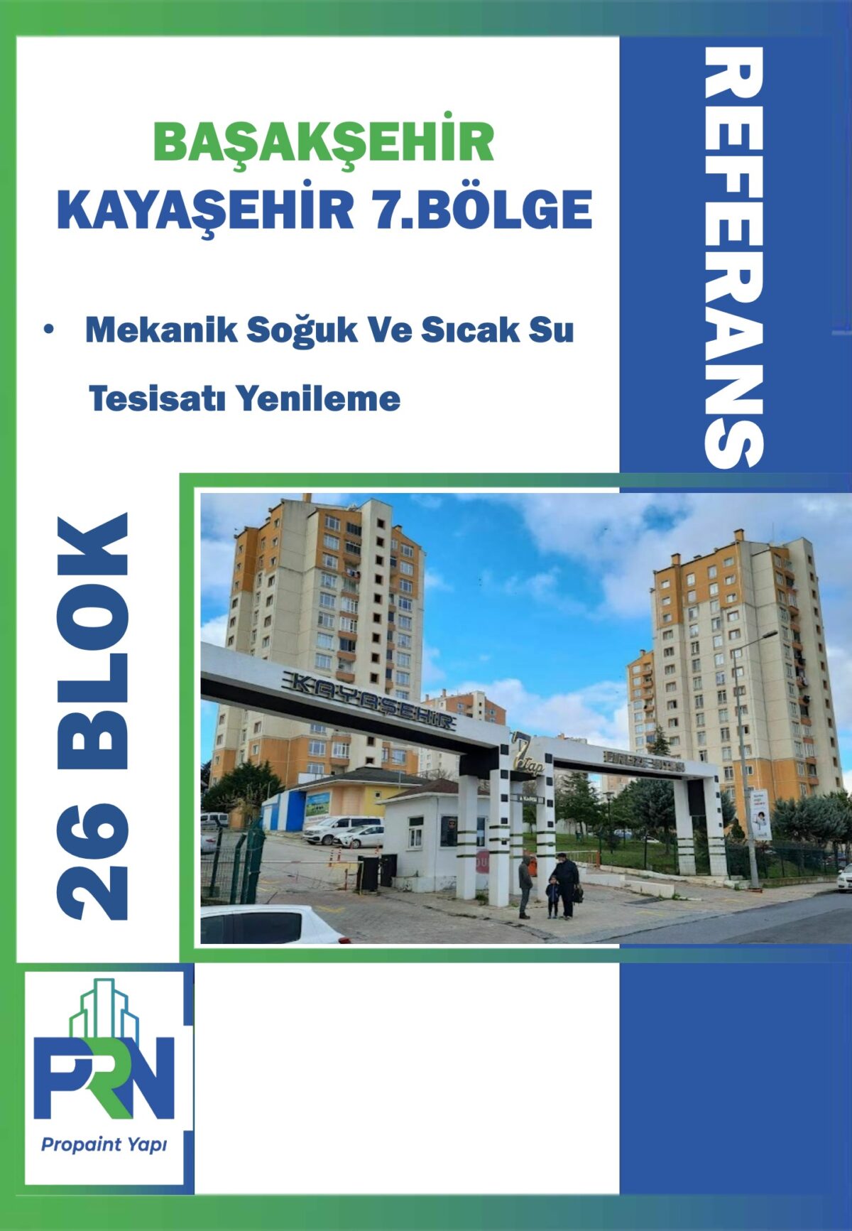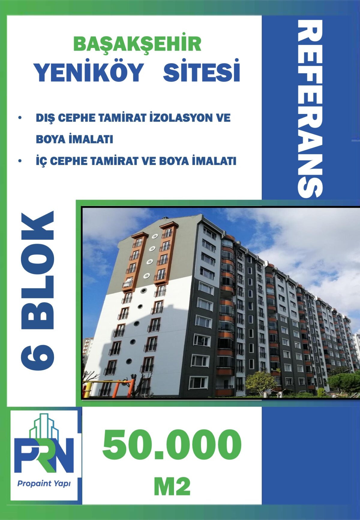 Proje: Başakşehir Yeniköy SitesiD-24 D-25 D-26 Blokları Metraj: 20.000 m2 Yapılan Çalışma: Tüm Dış ve İç Cephe YalıtımBoya İmalatları Yağmur İniş Boruların Değişimi