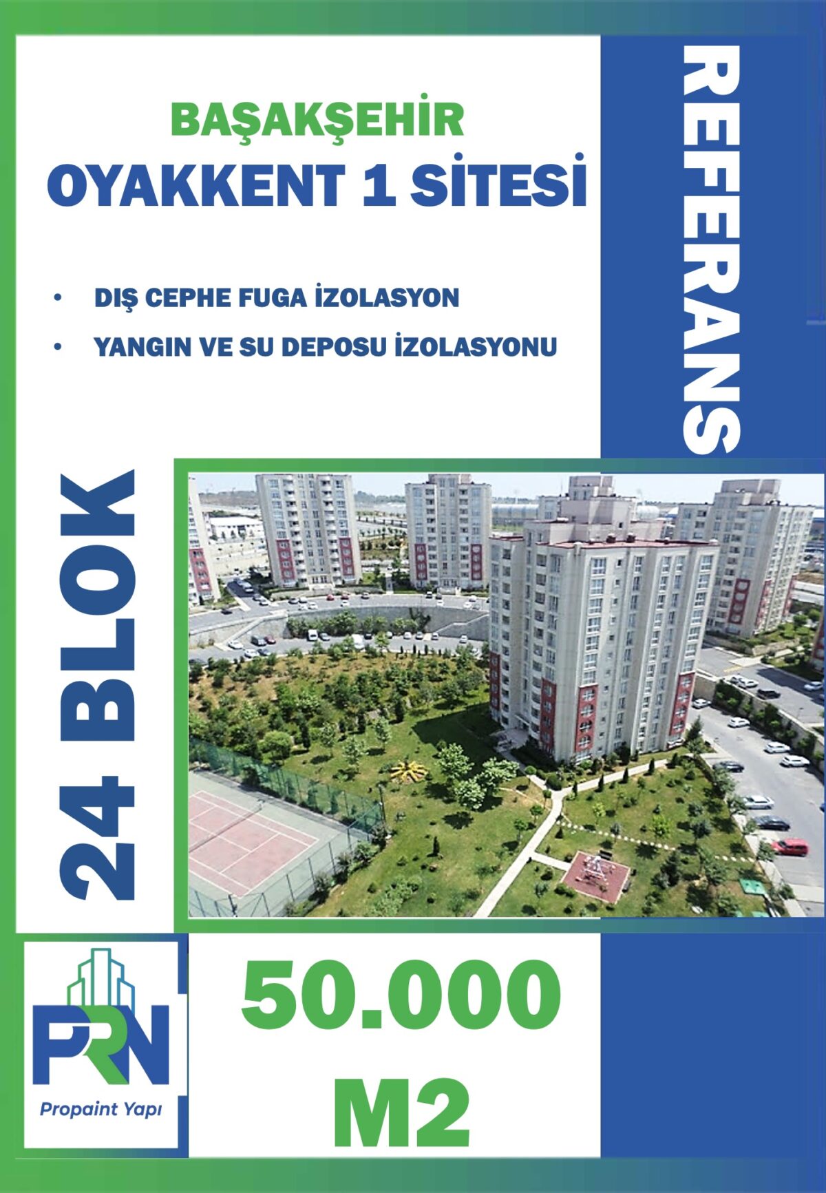 Proje: Oyakkent 1.Etap – Başakşehir Metraj: 50.000 m2 Yapılan Çalışma: Dış Cephe Fga İzolasyon,Yangın ve Su Depoları İzolasyonu