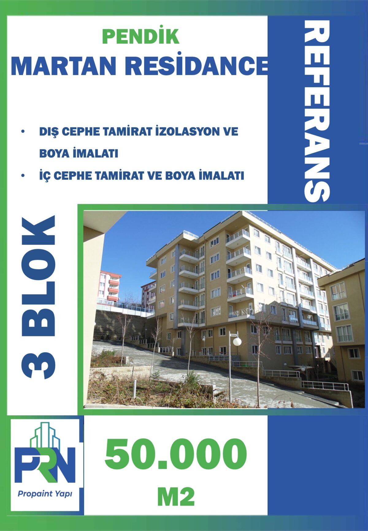 Proje: PENDİK MARTAN RESİDANCE Metraj: 40.000 M2 (3 BLOK) Tarih: 01.12.2011 Yapılan Çalışma: Dış – İç cephe Boya tamir ve fuga izolasyon işi