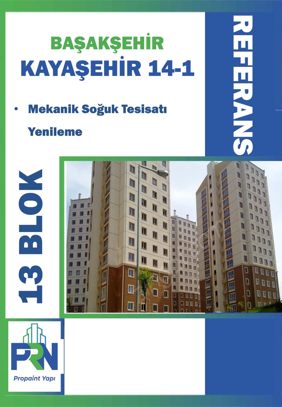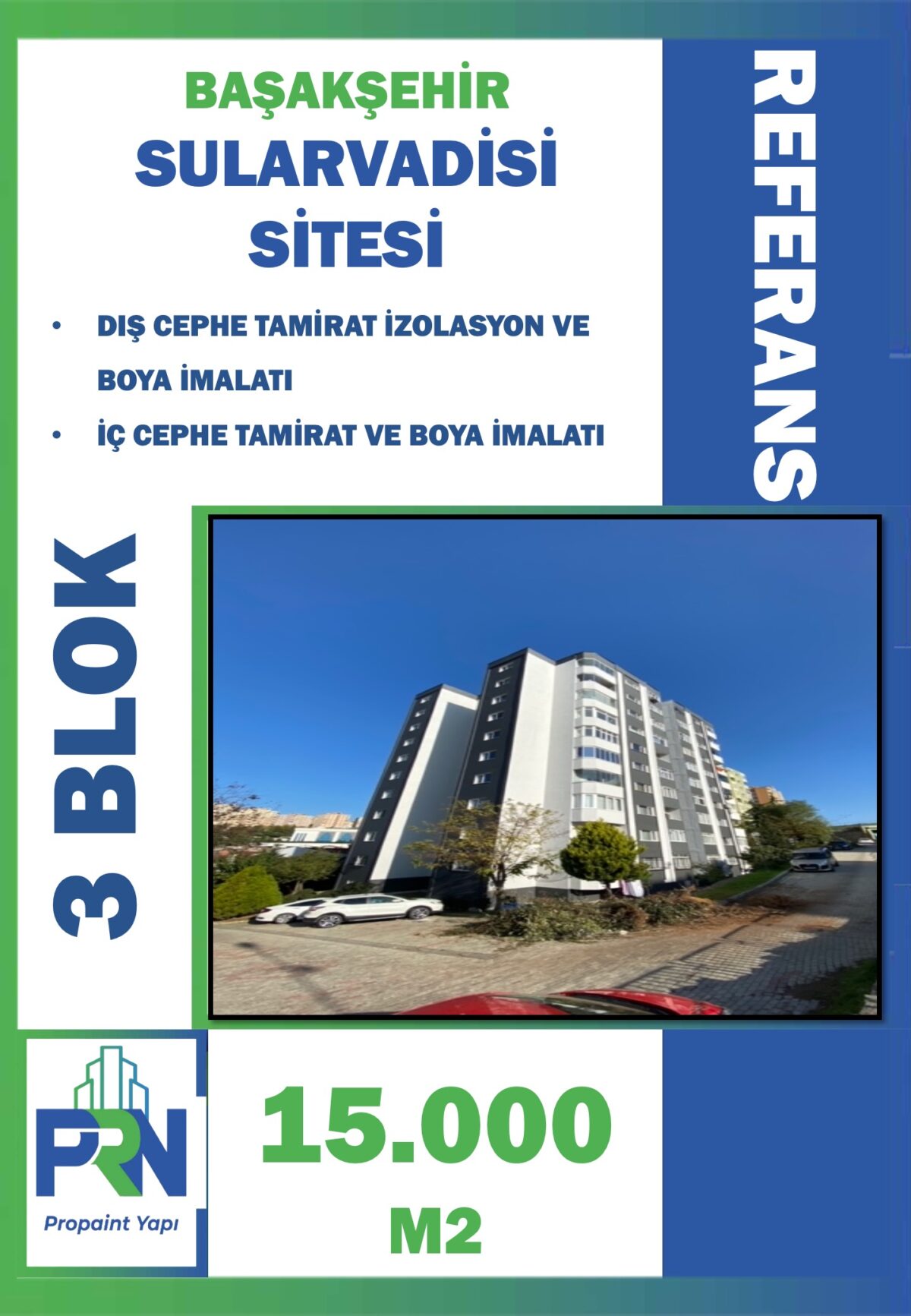 Proje: Başakşehir Vadipark Evleri M-13 Blok Metraj: 7.200 m2 Yapılan Çalışma: Tüm Dış ve İç Cephe YalıtımBoya İmalatları