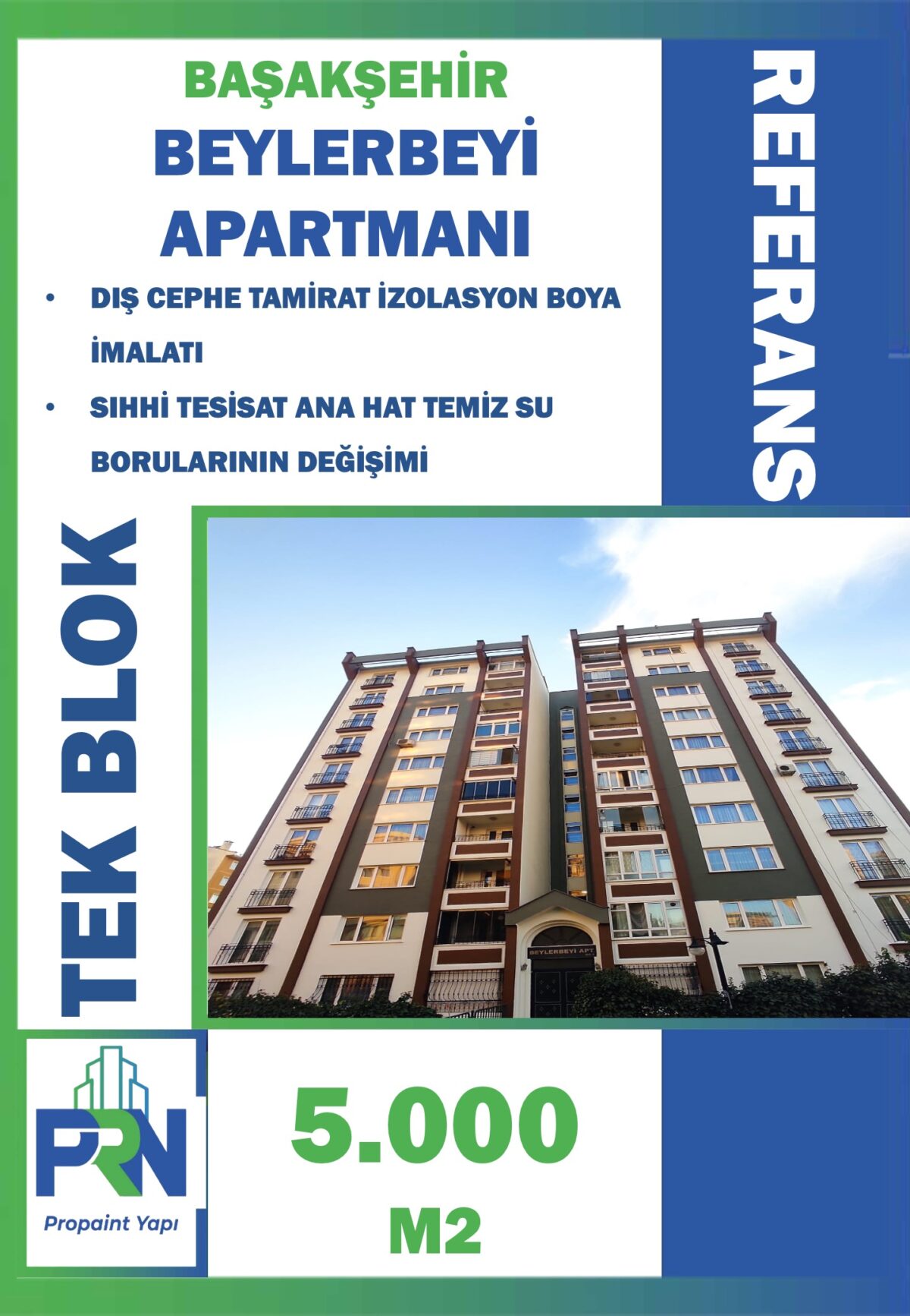Proje: BAŞAKŞEHİR BEYLERBEYİ APARTMANI Metraj: 5.000 M2 (TEK BLOK) Tarih: 05.11.2021 Yapılan Çalışma: Dış cephe onarım izolasyon ve boya imalatı / Sıhhi tesisat Soğuk Su borusu değişimi