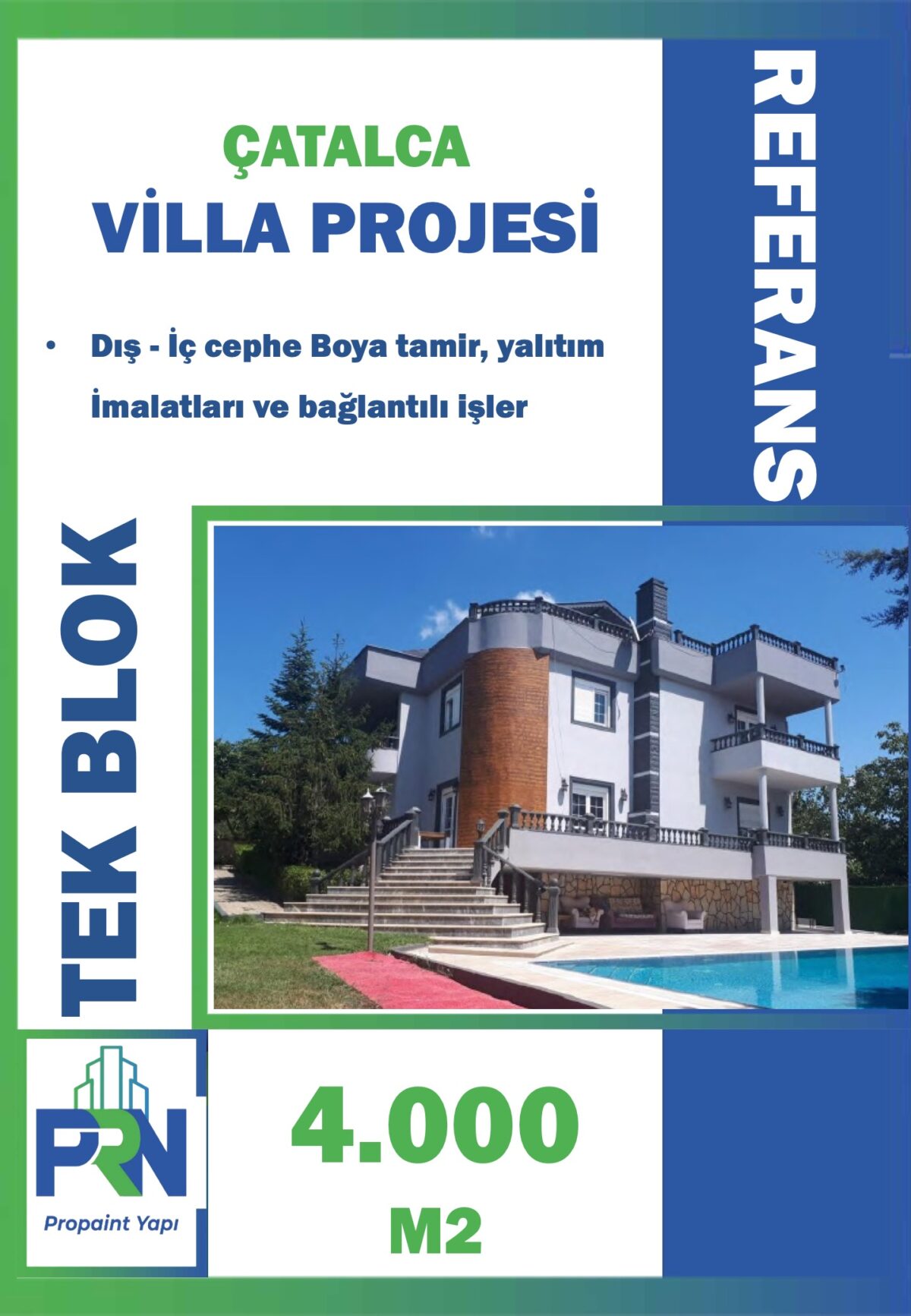 Proje: ÇATALCA VİLLA PROJESİ Metraj: 4.000 M2 (TEK BLOK) Tarih: 27.05.2021 Yapılan Çalışma: Dış – İç cephe Boya tamir, yalıtım İmalatları ve bağlantılı işler