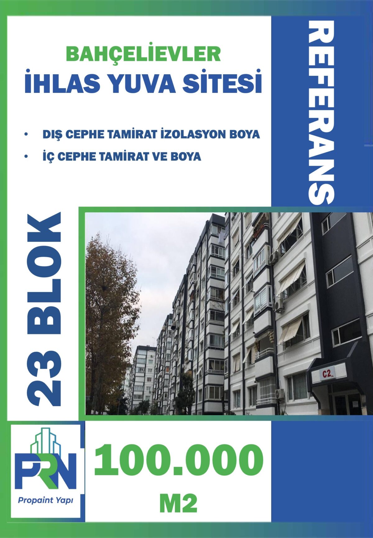 Proje: İhlas Yuva Sitesi – Bahçelievler Metraj: 100.000 m² Yapılan Çalışma: Sitede Bulunan 23 BLOK Tüm Dış ve İç Cephe Yalıtım Boya İmalatları