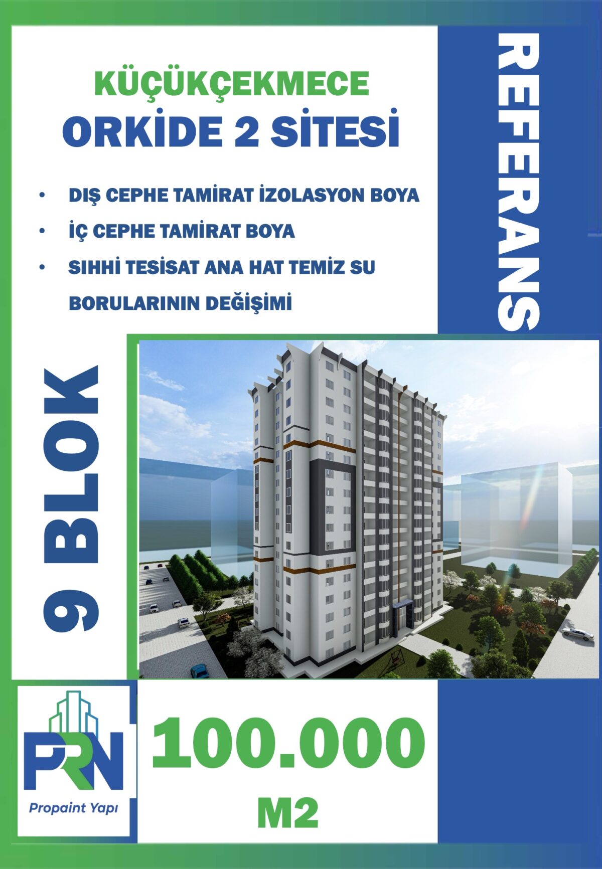 Proje: HALKALI ORKİDE 2 SİTESİ Metraj: 78.000 M2 (9 BLOK) Tarih: Devam ediyor Yapılan Çalışma: Dış ve iç cephe onarım izolasyon ve boya imalatı / Sıhhi tesisat Temiz su borularının değişimi