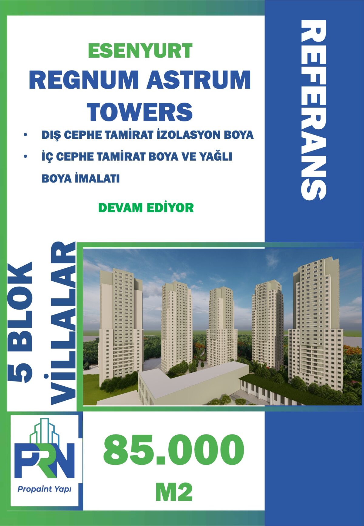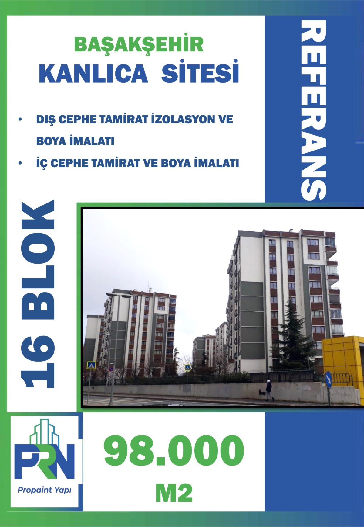 Proje: Başakşehir 5.Etap Kanlıca Sitesi Metraj: 45.600 m2 Yapılan Çalışma: Sitede Bulunan Blokların; Tüm Dış ve İç Cephe YalıtımBoya İmalatları